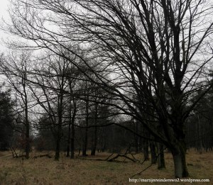 Figuur 10. Door deze oude bomenrij kon een pad teruggevonden worden dat thans niet meer in gebruik is. De kijkrichting is westwaarts. Links is nog net een bospad zichtbaar dat thans nog in gebruik is (foto van de auteur).