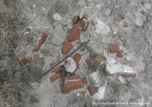 Figuur 12. Een berg vondsten zoals ze bij elkaar lagen op een afgeplagd stuk heide. Het gaat hier om bakstenen (deels nog aan elkaar gemetseld) en metalen staven (foto van de auteur).