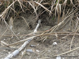 Figuur 9. Door graafwerk van dieren werd deze ‘tunnel’ van circa 50 centimeter breed op verschillende punten blootgelegd. De diepte ervan is niet bekend. Duidelijk zichtbaar links is een stuk houtwolcementplaat dat werd gebruikt voor fundering van het plafond. Rechts is nog net een stuk oranje-rode dakpan te zien (foto van de auteur).