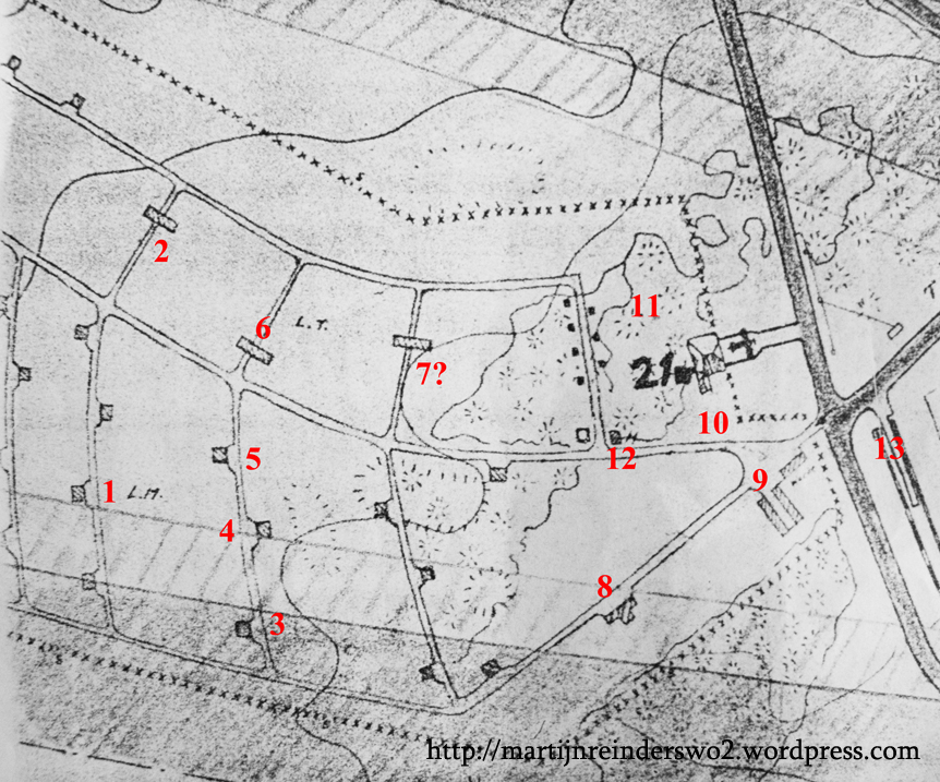 Voor een dergelijk “onderzoek” is improvisatie nodig. Zo zijn alle bezochte locaties genummerd (zie figuur 1). Ook is de hele munitieopslag opgedeeld in drie delen (zie vorig hoofdstuk). Hier wordt in het volgende hoofdstuk, alsmede de sporen- en vondstenlijst (tabellen 1 en 2) naar verwezen. De locaties zijn gebaseerd op de Duitse kaart van de Fliegerhorst.