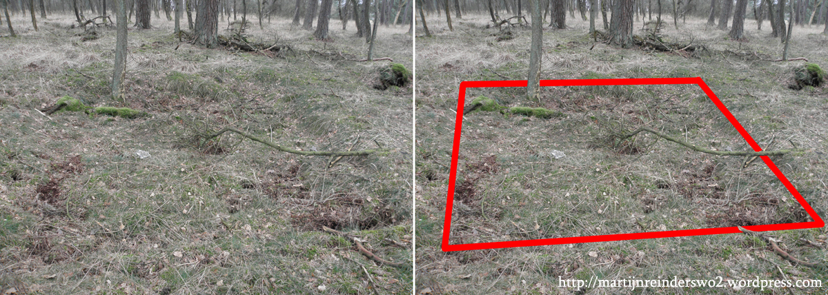 Figuur 5. Rechthoekige begroeiing op een klein walletje toont de locatie van een voormalig munitiebunkertje (locatie 1) (foto van de auteur).