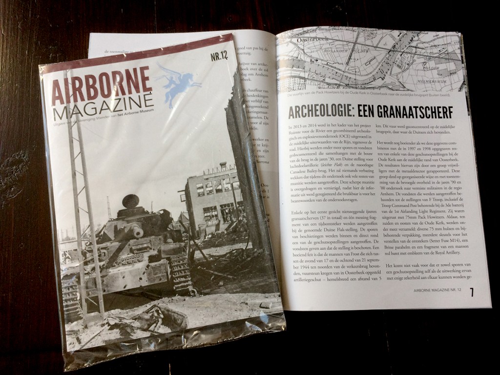 Vanaf heden verschijnt in het Airborne Magazine een rubriek van mijn hand over (archeologische) bodemvondsten die een relatie hebben met de Slag om Arnhem (september 1944) in de ruime betekenis. Dit zijn vondsten uit archeologisch onderzoek, een toevalsvondst of een object dat reeds decennia uit de grond is gegraven. De objecten die ik hier bespreek zijn geen anonieme objecten van een militariabeurs of museumstukken waarvan de herkomst onbekend is. Ook zullen hier niet enkel wapen-gerelateerde zaken of militaire uitrusting de revue passeren. Elk voorwerp, hoe klein of onooglijk ook, vertelt echter wel zijn eigen verhaal. Het zijn tastbare herinneringen en soms persoonlijke getuigenissen van alle mensen die betrokken waren bij deze zwarte periode in de geschiedenis.